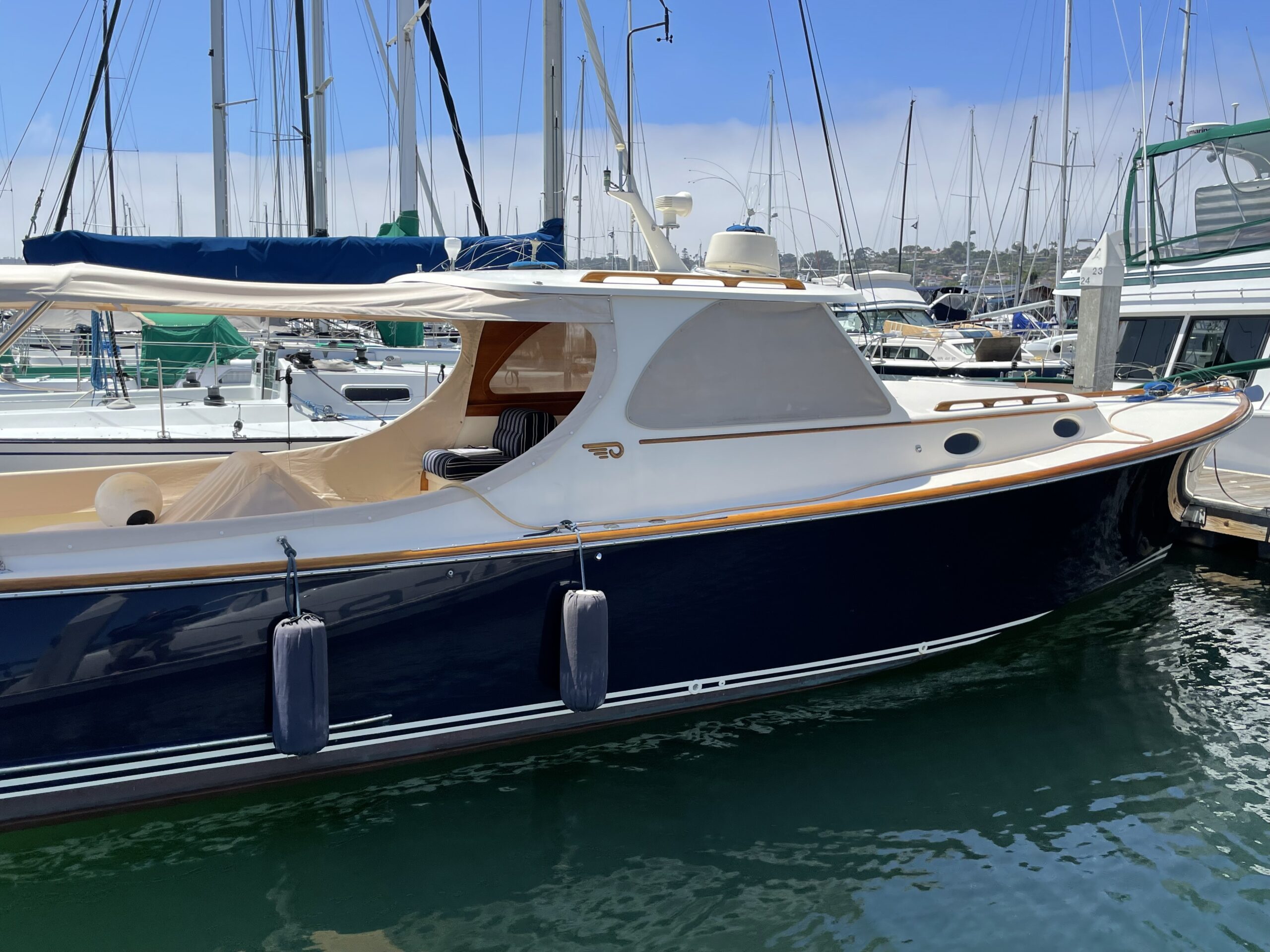 Beautifully maintained, San Diego based . The graceful design, jet wash propulsion system, large open cockpit and joystick handling make this a perfect boat for cruising San Diego Bay and surrounding waters. Key highlights include an Awlgrip Navy blue hull, a full cockpit Bimini, and a B&G electronics suite. A complete jet wash system overhaul and new bottom paint was done in October, 2024, followed by complete engine maintenance in 2026. The boat boasts a Kevlar E-glass hybrid hull with a balsa core, vacuum-bagged using Vinylester resin. The deck and cockpit are crafted from E-glass and balsa core, molded in polyester resin. Equipped with a Hamilton water jet propulsion system and the JetStick, this boat offers precise and responsive steering, making it simple to navigate, even in confined spaces. It’s renowned for its smooth ride and capability to navigate shallow waters thanks to its shallow 18 inch draft. The interior features elegant satin varnished cherry finishes and a teak and holly cabin sole. It comfortably accommodates two for sleeping and provides generous space in the pilothouse/cockpit for entertaining guests. Interior amenities include a galley with a two-burner stove and refrigerator, a private head, and an Accu-point heater. Externally, you’ll find beautifully varnished teak toe rails, handrails, and a custom Hinckley varnished teak bowsprit including a full suite of boat and window covers plus cockpit drapes. LLC owned.